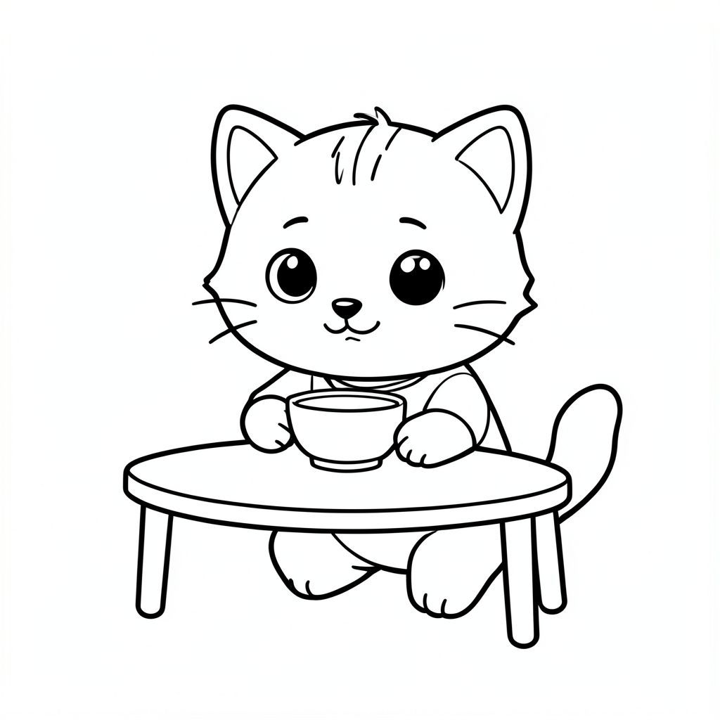 Baby cat eating from a small bowl, sitting at simple table, Kawaii baby cat, big round head, tiny body, short legs, small paws, simple cute pose matching activity, large round eyes, small black nose, cute smile, chubby cheeks, 3 small lines on forehead, simple whiskers, small ears with inner detail, smooth tail curved, wearing simple shirt, thick bold clean outline, same line weight, no color, no shading, no grayscale, no extra detail, large open spaces, simple background, kid friendly style, ages 3 to 6 --ar 2:3