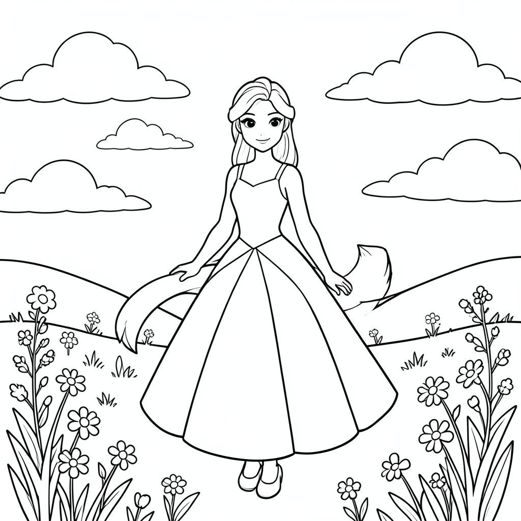 Elsa stands gracefully in a sunlit meadow beneath a clear sky dotted with soft white clouds. The scene features a simple, balanced composition with the single Elsa positioned centrally, her elegant form outlined in clean, precise lines. Her body is slender and graceful, with a long, flowing tail that curves gently behind her. The background shows a peaceful garden setting with scattered wildflowers and gentle hills. The entire illustration maintains a calm, serene atmosphere with no shadows, no , and no color. The single animal subject is rendered with accurate anatomical proportions, showing exactly one head, one body, and one tail as specified. The composition is carefully balanced with the subject placed in the center of the , surrounded by simple natural elements that enhance rather than distract from the elegant single figure., coloring page, line art, white background