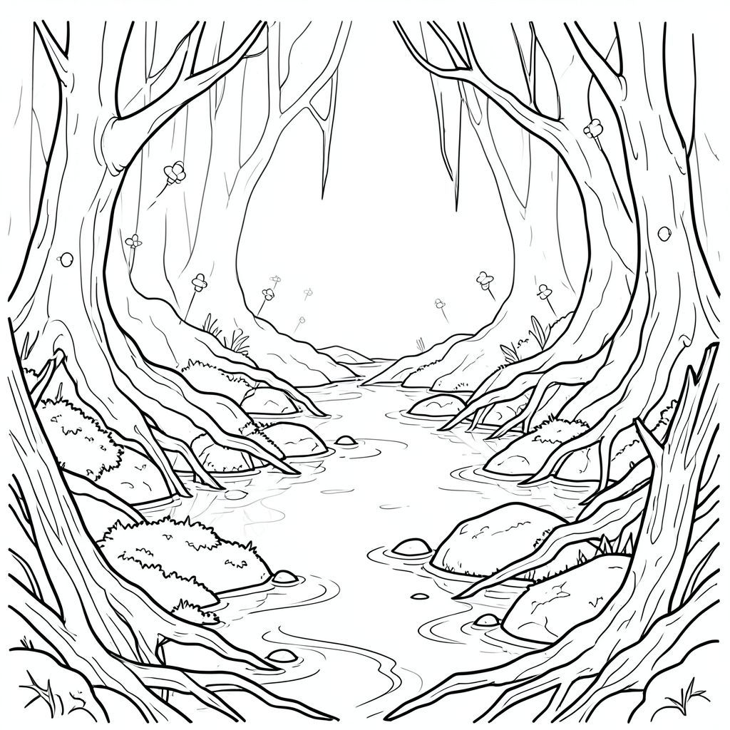 foggy swamp, twisted roots, fireflies, water, mossy stones, decaying wood, blurred, reflections, swirling mist, eerie