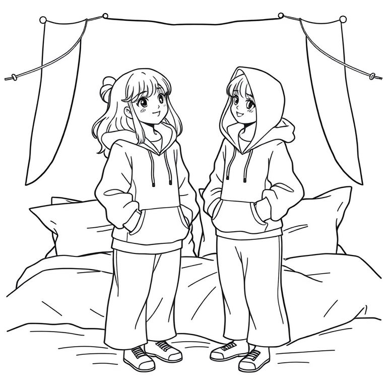 I girl having a sleepover with her bff the both girls stood up talking in a cute pose with long hoodies covering a short amount of thier legs both not wearing short and holding their hoodies down a bit, with pillows and bedding behind them smiling like the best things has happened