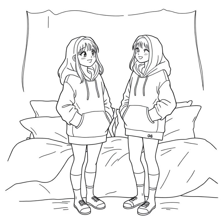 I girl having a sleepover with her bff the both girls stood up talking in a cute pose with long hoodies covering a short amount of thier legs both not wearing short and holding their hoodies down a bit, with pillows and bedding behind them smiling like the best things has happened none of them are wearing shorts or trousers the legs are showing and they aren’t a wearing shoes just long socks both hoods are down and hands are out of they’re pockets and holding the rim of the hoodies