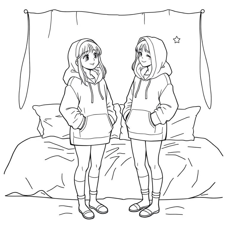 I girl having a sleepover with her bff the both girls stood up talking in a cute pose with long hoodies covering a short amount of thier legs both not wearing short and holding their hoodies down a bit, with pillows and bedding behind them smiling like the best things has happened none of them are wearing shorts or trousers the legs are showing and they aren’t a wearing shoes just long socks