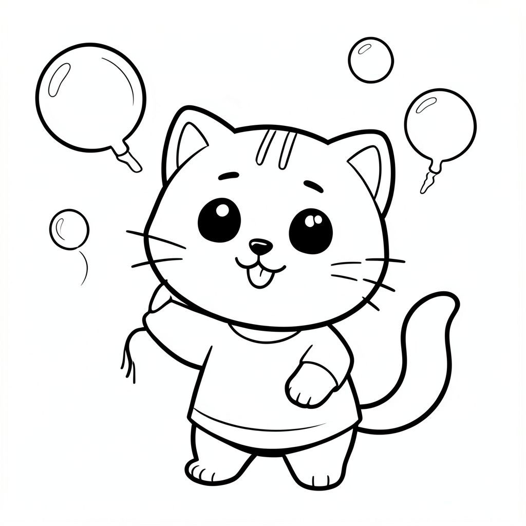 Kawaii baby cat blowing and playing with simple soap bubbles, soap bubbles floating in air, happy smiling face, Kawaii baby cat, big round head, tiny body, short legs, small paws, simple cute pose matching activity, large round eyes, small black nose, cute smile, chubby cheeks, 3 small lines on forehead, simple whiskers,