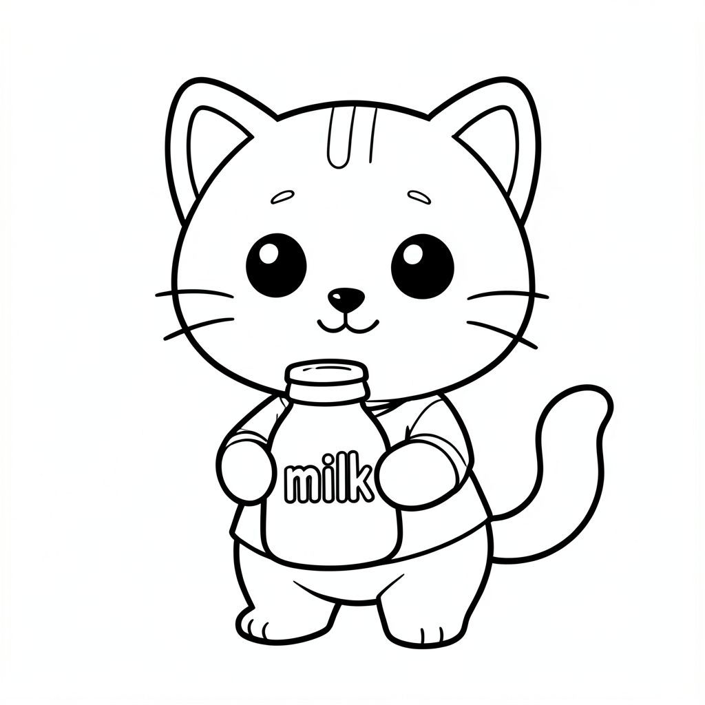 kawaii baby cat holding milk bottle with "milk" word written on bottle, clear and clean word visible on bottle, happy expression, Kawaii baby cat, big round head, tiny body, short legs, small paws, simple cute pose matching activity, large round eyes, small black nose, cute smile, chubby cheeks, 3 small lines on forehead, simple whiskers,