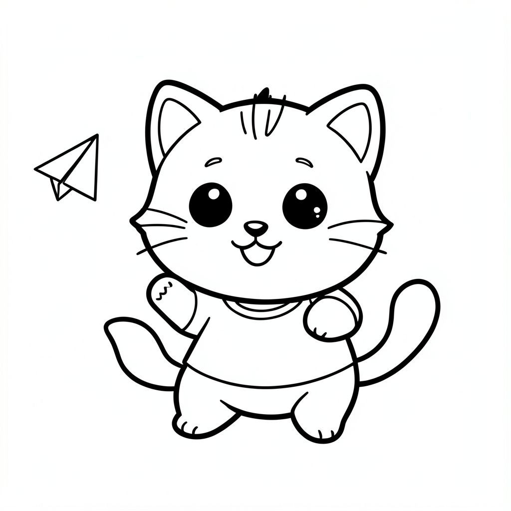 kawaii baby cat playing with simple paper plane, happy expression, Kawaii baby cat, big round head, tiny body, short legs, small paws, simple cute pose matching activity, large round eyes, small black nose, cute smile, chubby cheeks, 3 small lines on forehead, simple whiskers,