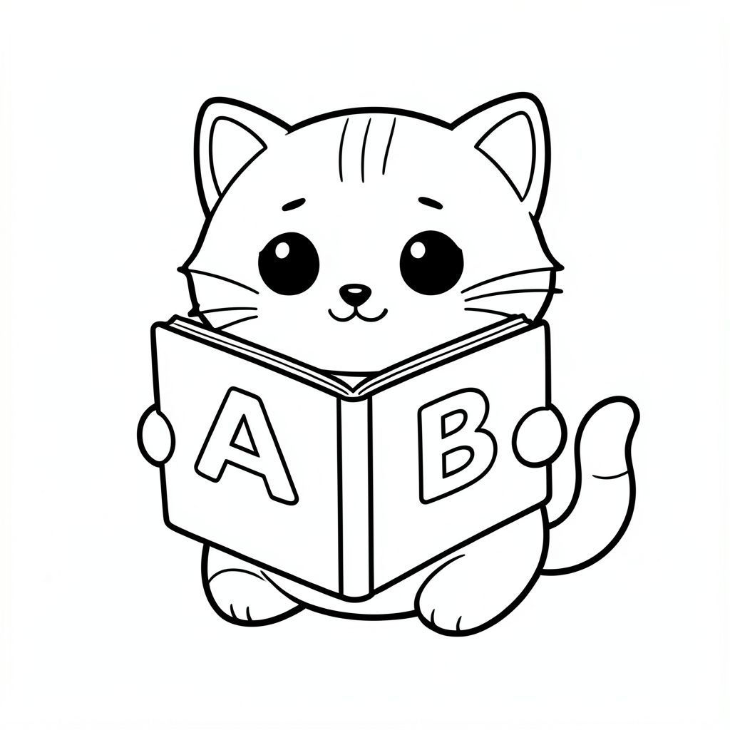 kawaii baby cat reading big book, book cover with A alpabhet on front cover clear visible and B alpabhet on back cover clear visible curious expression, Kawaii baby cat, big round head, tiny body, short legs, small paws, simple cute pose matching activity, large round eyes, small black nose, cute smile, chubby cheeks, 3 small lines on forehead, simple whiskers, small ears with inner detail, smooth tail curved, wearing simple shirt, thick bold clean outline, same line weight, no color, no shading, no grayscale, no extra detail, large open spaces, simple background, kid friendly style, ages 3 to 6 --ar 2:3