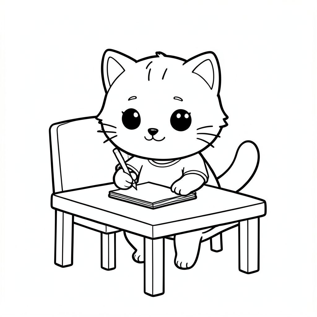 Kawaii baby cat sitting and writing on a simple notebook, minimal table, chair scene, be clean, clear visible, focused cute expression, Kawaii baby cat, big round head, tiny body, short legs, small paws, simple cute pose matching activity, large round eyes, small black nose, cute smile, chubby cheeks, 3 small lines on forehead, simple whiskers, small ears with inner detail, smooth tail curved, wearing simple shirt, thick bold clean outline, same line weight, no color, no shading, no grayscale, no extra detail, large open spaces, simple background, kid friendly style, ages 3 to 6 --ar 2:3