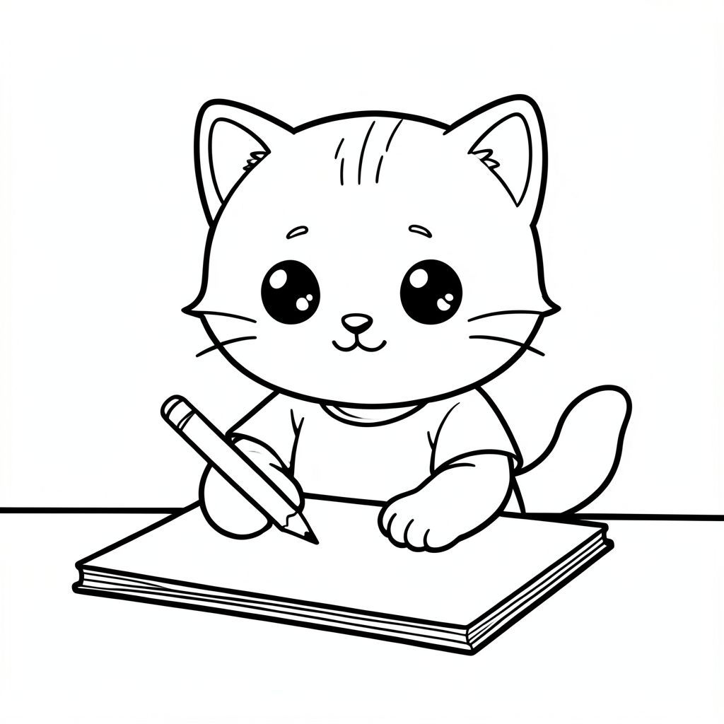 Kawaii baby cat sitting and writing on a simple notebook on table, pencil hold in right hand,pencil hold in hand clear, clean visible, focused cute expression, Kawaii baby cat, big round head, tiny body, short legs, small paws, simple cute pose matching activity, large round eyes, small black nose, cute smile, chubby cheeks, 3 small lines on forehead, simple whiskers, small ears with inner detail, smooth tail curved, wearing simple shirt, thick bold clean outline, same line weight, no color, no shading, no grayscale, no extra detail, large open spaces, simple background, kid friendly style, ages 3 to 6 --ar 2:3