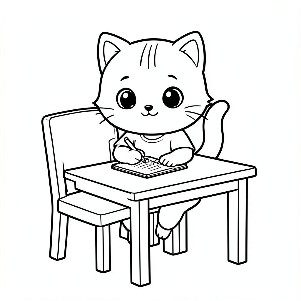 Kawaii baby cat sitting on chair and writing on a simple notebook on table, table, chair must be clean, clear visible, focused cute expression, Kawaii baby cat, big round head, tiny body, short legs, small paws, simple cute pose matching activity, large round eyes, small black nose, cute smile, chubby cheeks, 3 small lines on forehead, simple whiskers, small ears with inner detail, smooth tail curved, wearing simple shirt, thick bold clean outline, same line weight, no color, no shading, no grayscale, no extra detail, large open spaces, simple background, kid friendly style, ages 3 to 6 --ar 2:3