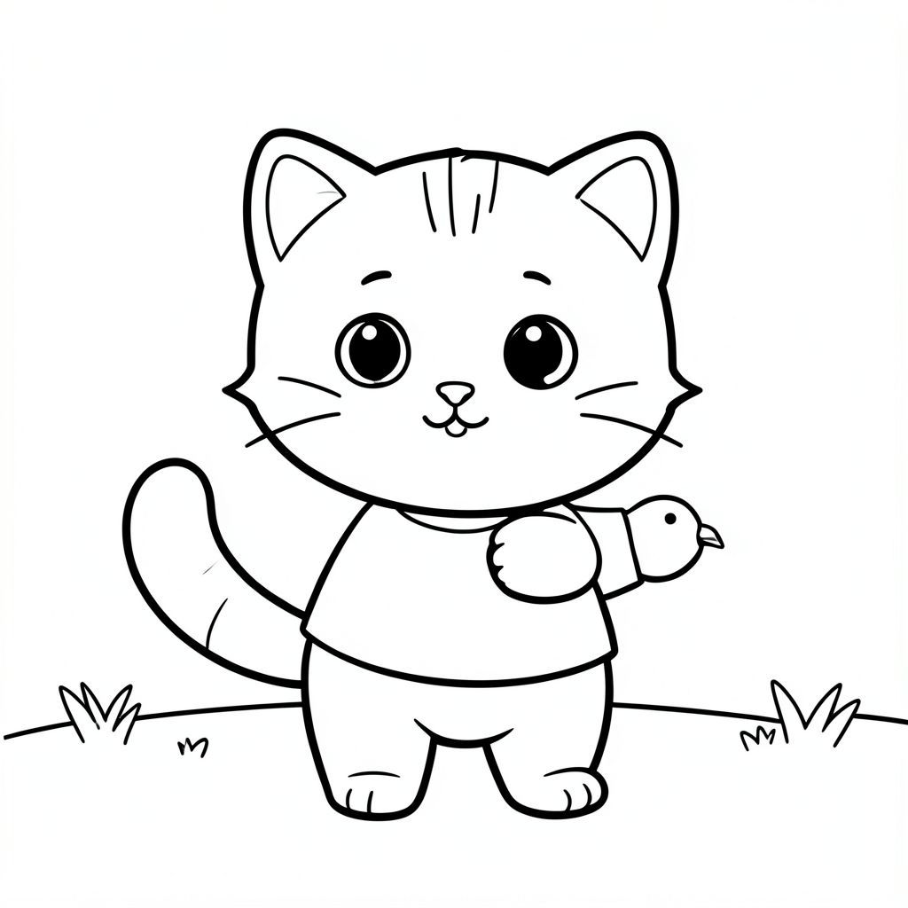 kawaii baby cat standing and feeding simple liitle birds, minimal outdoor scene, Kawaii baby cat, big round head, tiny body, short legs, small paws, simple cute pose matching activity, large round eyes, small black nose, cute smile, chubby cheeks, 3 small lines on forehead, simple whiskers,