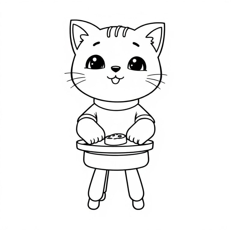 Kawaii baby cat standing on a small stool and placing cookies on a tray, happy focused expression, Kawaii baby cat, big round head, tiny body, short legs, small paws, simple cute pose matching activity, large round eyes, small black nose, cute smile, chubby cheeks, 3 small lines on forehead, simple whiskers,