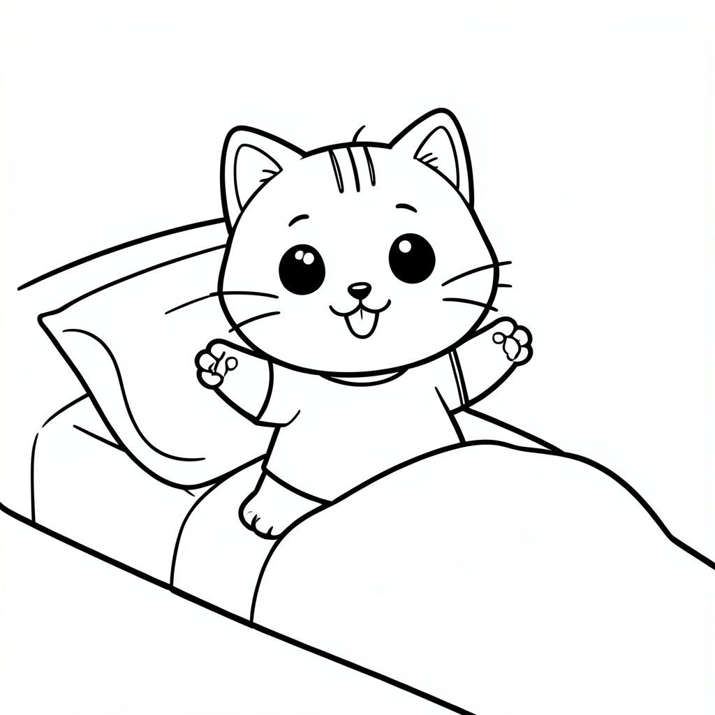 Kawaii baby cat waking up in bed, stretching arms and smiling, Kawaii baby cat, big round head, tiny body, short legs, small paws, simple cute pose matching activity, large round eyes, small black nose, cute smile, chubby cheeks, 3 small lines on forehead, simple whiskers,