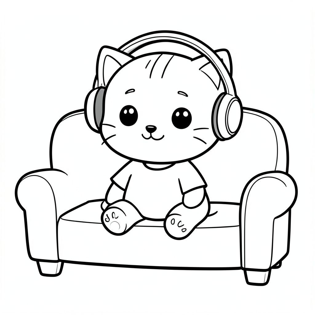 kawaii baby cat wearing headphone, sitting relaxed, happy, calm on sofa, both ears clear visible, Kawaii baby cat, big round head, tiny body, short legs, small paws, simple cute pose matching activity, large round eyes, small black nose, cute smile, chubby cheeks, 3 small lines on forehead, simple whiskers, small ears with inner detail, smooth tail curved, wearing simple shirt, thick bold clean outline, same line weight, no color, no shading, no grayscale, no extra detail, large open spaces, simple background, kid friendly style, ages 3 to 6 --ar 2:3