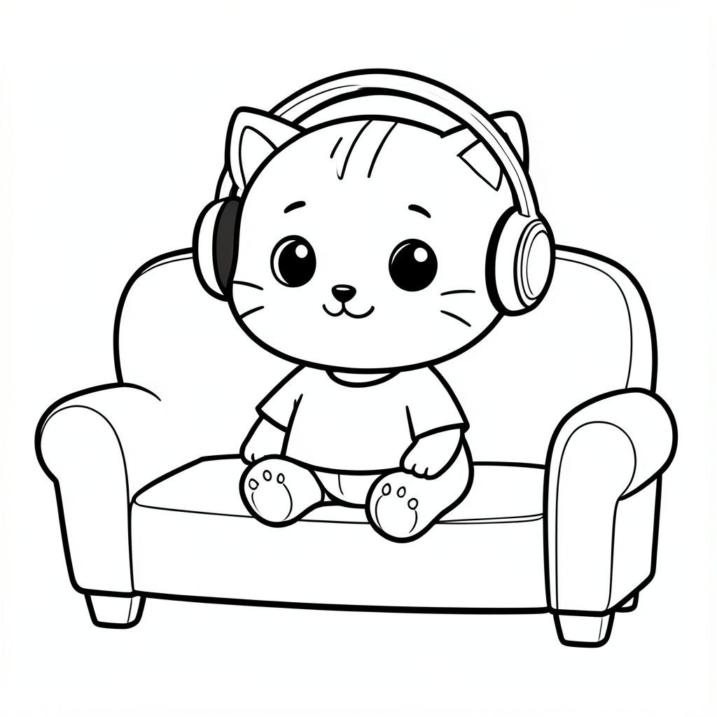 kawaii baby cat wearing headphone, sitting relaxed, happy, calm on sofa, Kawaii baby cat, big round head, tiny body, short legs, small paws, simple cute pose matching activity, large round eyes, small black nose, cute smile, chubby cheeks, 3 small lines on forehead, simple whiskers,