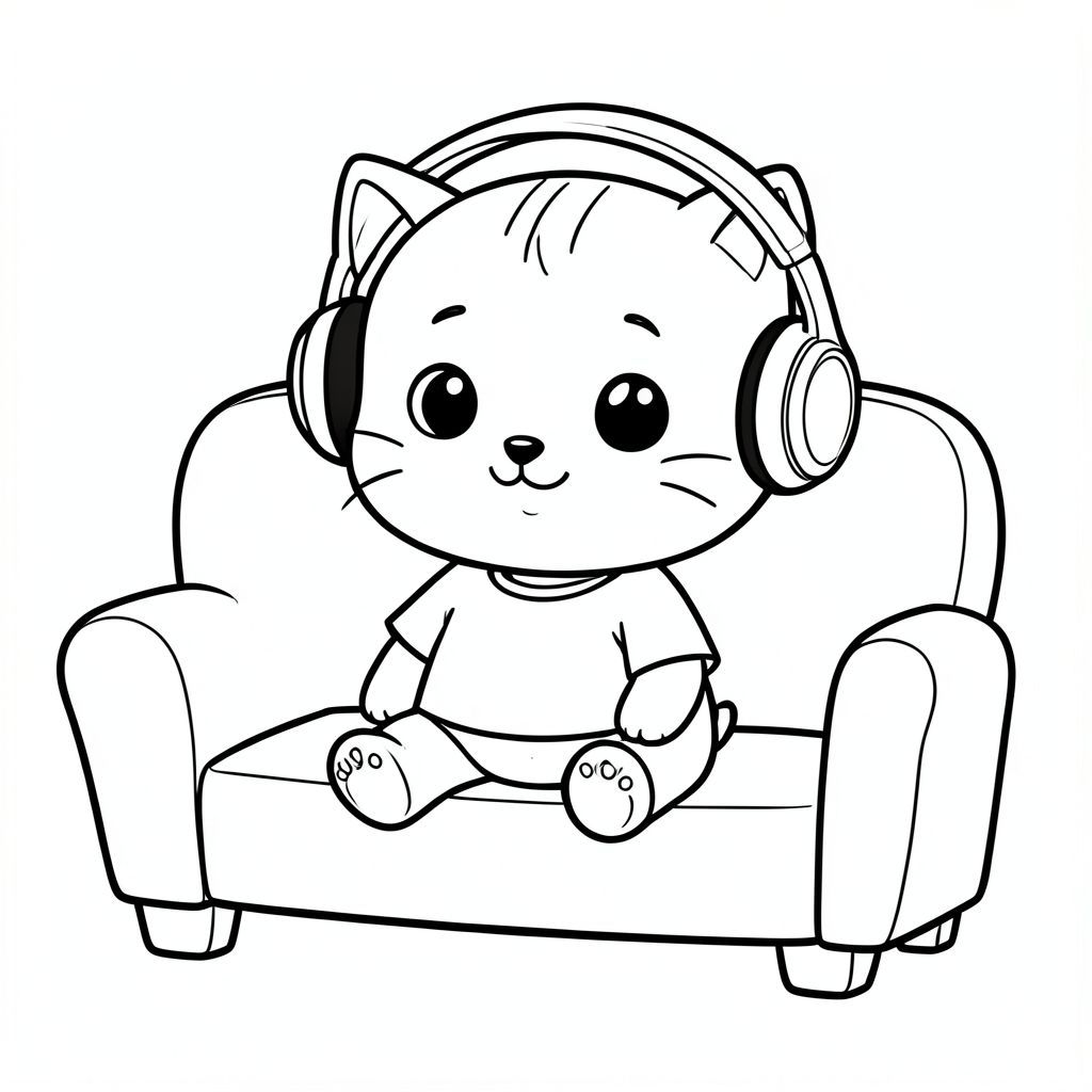 kawaii baby cat wearing headphone, sitting relaxed, happy expresion on sofa, keep headphone back of both ears. Kawaii baby cat, big round head, tiny body, short legs, small paws, simple cute pose matching activity, large round eyes, small black nose, cute smile, chubby cheeks, 3 small lines on forehead, simple whiskers, small ears with inner detail, smooth tail curved, wearing simple shirt, thick bold clean outline, same line weight, no color, no shading, no grayscale, no extra detail, large open spaces, simple background, kid friendly style, ages 3 to 6 --ar 2:3