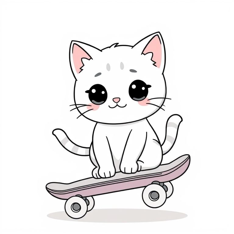 kawaii cat riding a skateboard, cute pastel colors, soft lighting, cartoon style, simple background, vibrant and clean, high quality digital illustration, adorable and cheerful expression, smooth shading, white background