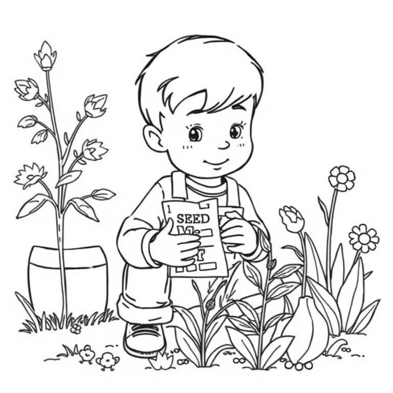 Little boy holding a seed packet put in the garden. He was told if he is kind of blamed so long tells him let's make cookies and take them next door