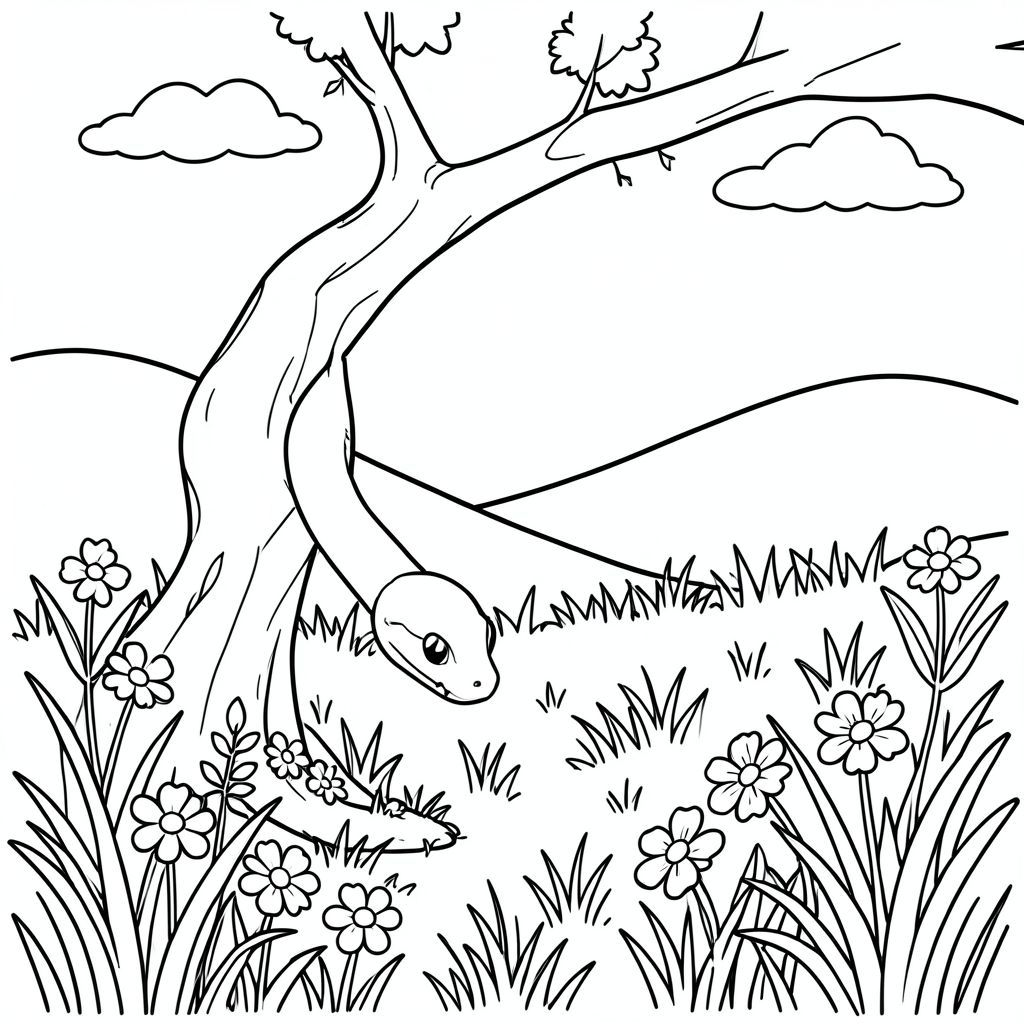 snake wrap around tree branch looking down the ground full of grass grass and flower, hill and sky on the background