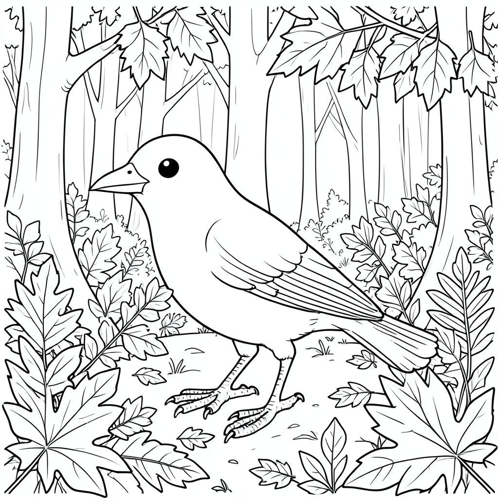 solo, single bird, one head, two eyes, one beak, two wings, two legs, one tail, anatomically correct, bird, leaves, autumn foliage, leaves, dense forest, panoramic view, wide angle, detailed, realistic, atmospheric, sunlight, coloring page, line art, white background, solo, single subject, anatomically correct, perfect anatomy