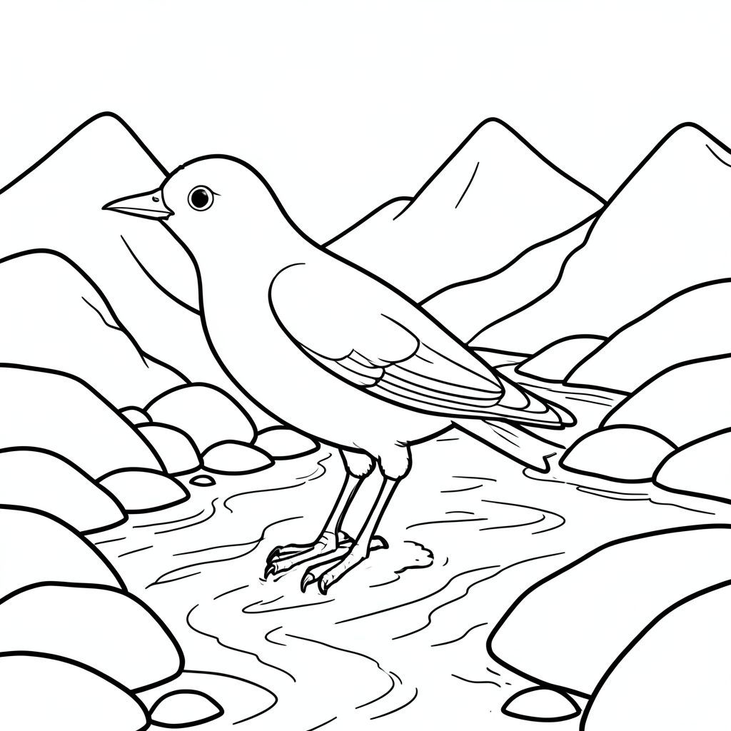 solo, single bird, one head, two eyes, one beak, two wings, two legs, one tail, anatomically correct, bird, Mountain, river, water, rocks, smooth, boulders, rushing, flow, sunlight, wide, coloring page, line art, white background, solo, single subject, anatomically correct, perfect anatomy