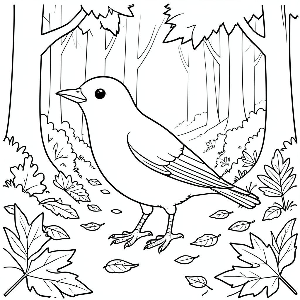solo, single bird, one head, two eyes, one beak, two wings, two legs, one tail, natural proportions, proper scale in environment, anatomically correct, bird, Autumn forest, path, leaves, fallen, trail, simple, clean, environment, woodland, foliage, coloring page, line art, white background, solo, single subject, anatomically correct, perfect anatomy