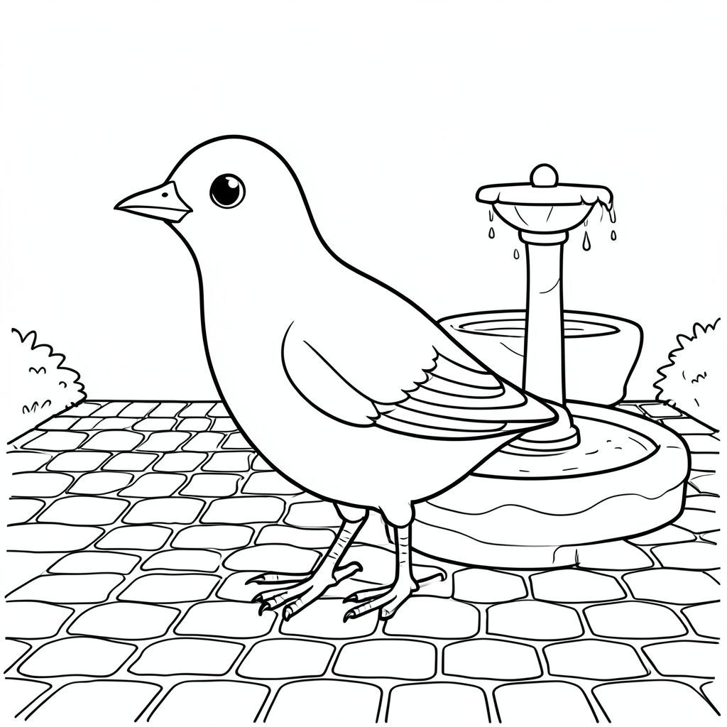 solo, single bird, one head, two eyes, one beak, two wings, two legs, one tail, natural proportions, proper scale in environment, anatomically correct, bird, Fountain, courtyard, cobblestones, small, simple, clean, background, stone, path, small, coloring page, line art, white background, solo, single subject, anatomically correct, perfect anatomy