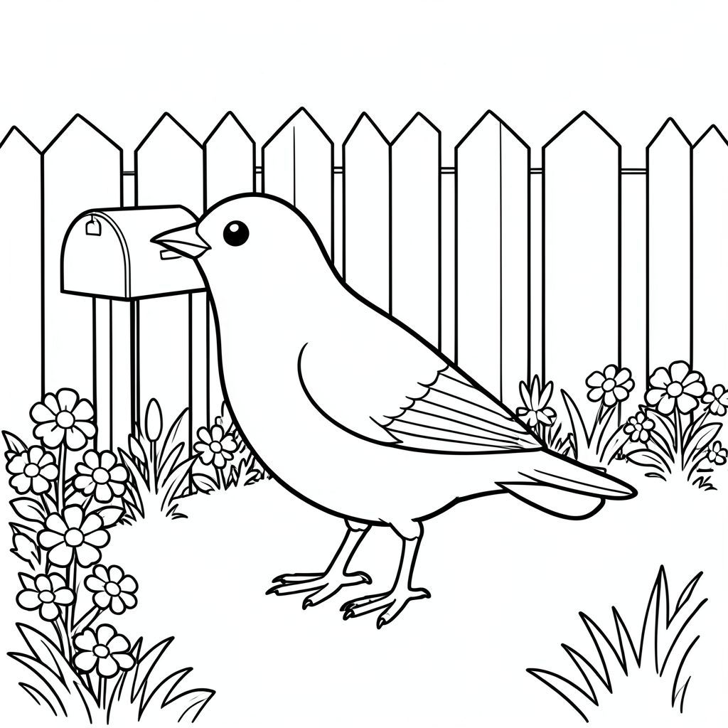 solo, single bird, one head, two eyes, one beak, two wings, two legs, one tail, natural proportions, proper scale in environment, anatomically correct, bird, Front yard, mailbox, garden border, simple, clean, sunny, grass, flowers, wooden fence, simple background, coloring page, line art, white background, solo, single subject, anatomically correct, perfect anatomy