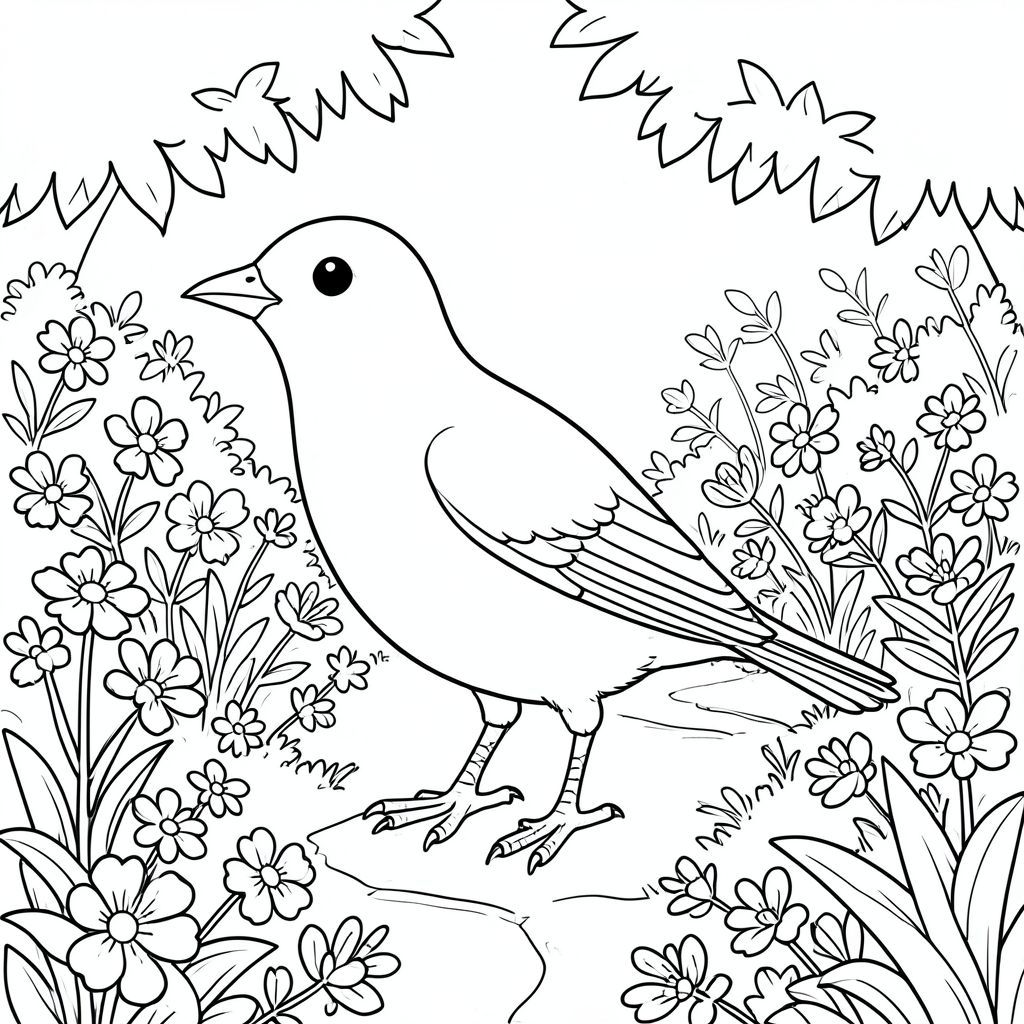 solo, single bird, one head, two eyes, one beak, two wings, two legs, one tail, natural proportions, proper scale in environment, anatomically correct, bird, garden, flowers, pathways, greenery, sunlight, dappled, winding, lush, detailed, realistic, coloring page, line art, white background, solo, single subject, anatomically correct, perfect anatomy