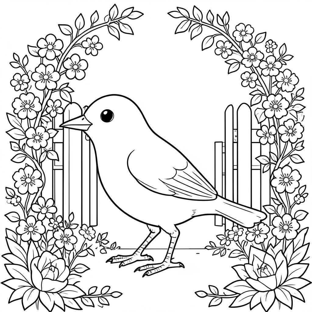 solo, single bird, one head, two eyes, one beak, two wings, two legs, one tail, natural proportions, proper scale in environment, anatomically correct, bird, garden, gate, climbing vine, flowers, lush, soft, sunlight, clear, sky, simple, coloring page, line art, white background, solo, single subject, anatomically correct, perfect anatomy