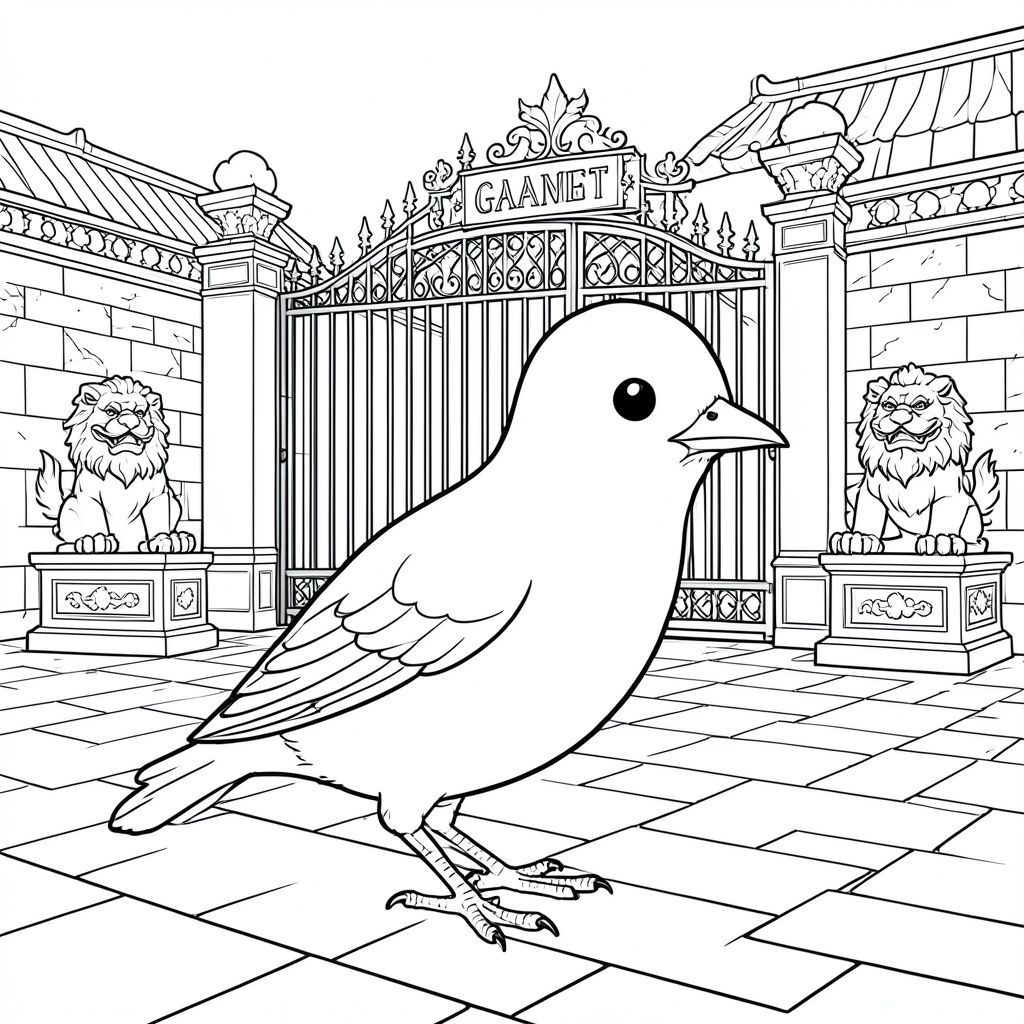 solo, single bird, one head, two eyes, one beak, two wings, two legs, one tail, natural proportions, proper scale in environment, anatomically correct, bird, Grand palace, gate, iron railings, stone lions, ornate, detailed, realistic, environment, courtyard, stone, coloring page, line art, white background, solo, single subject, anatomically correct, perfect anatomy