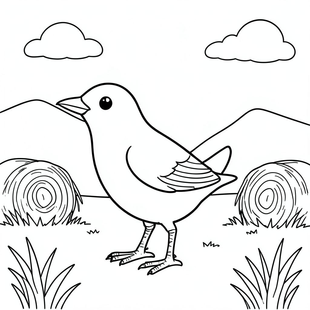 solo, single bird, one head, two eyes, one beak, two wings, two legs, one tail, natural proportions, proper scale in environment, anatomically correct, bird, grass, round hay bales, sunlight, clear sky, simple background, clean lines, storybook, pure, simple, peaceful, coloring page, line art, white background, solo, single subject, anatomically correct, perfect anatomy