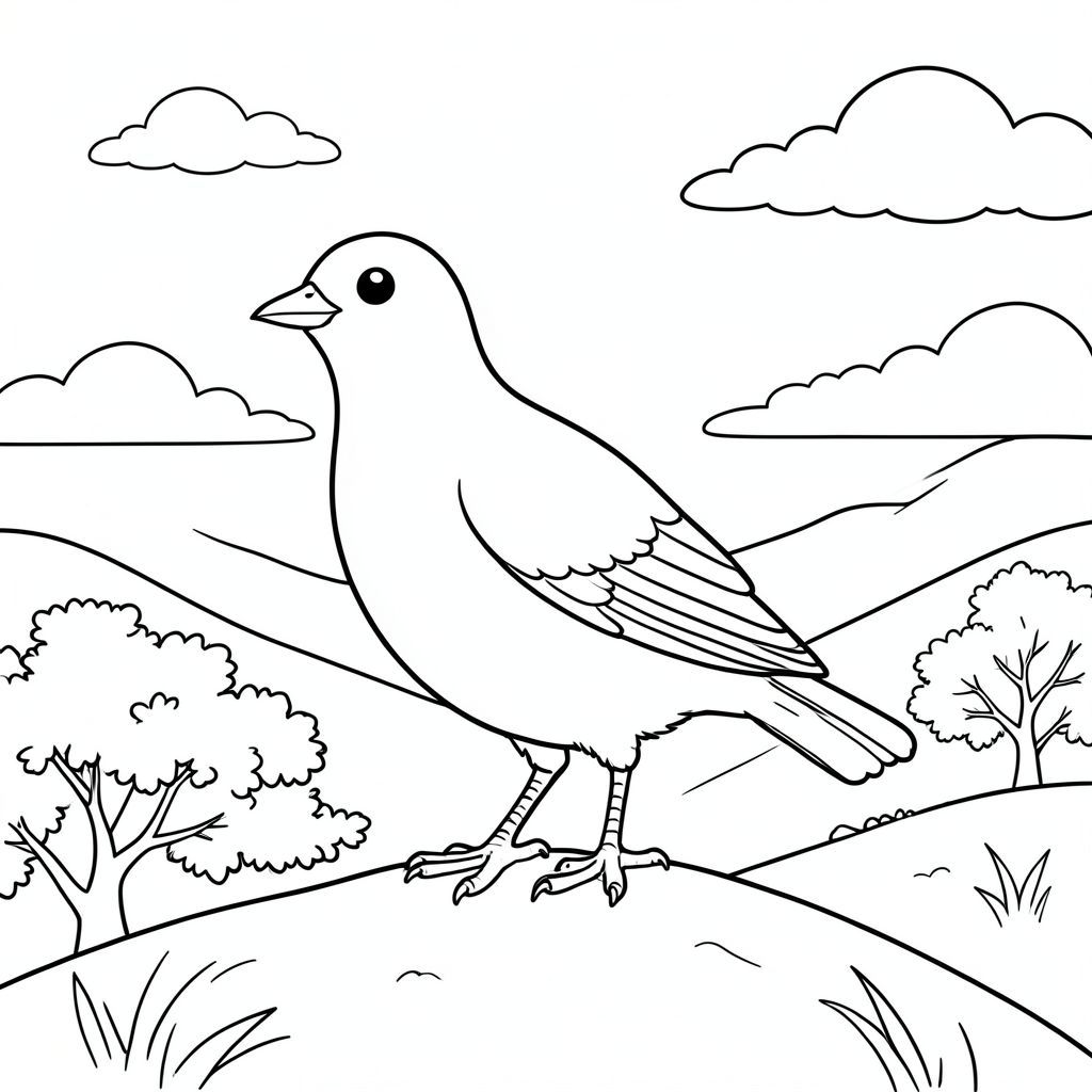 solo, single bird, one head, two eyes, one beak, two wings, two legs, one tail, natural proportions, proper scale in environment, anatomically correct, bird, hilltop, tree, valley, panorama, simple, clean, background, landscape, horizon, clouds, coloring page, line art, white background, solo, single subject, anatomically correct, perfect anatomy
