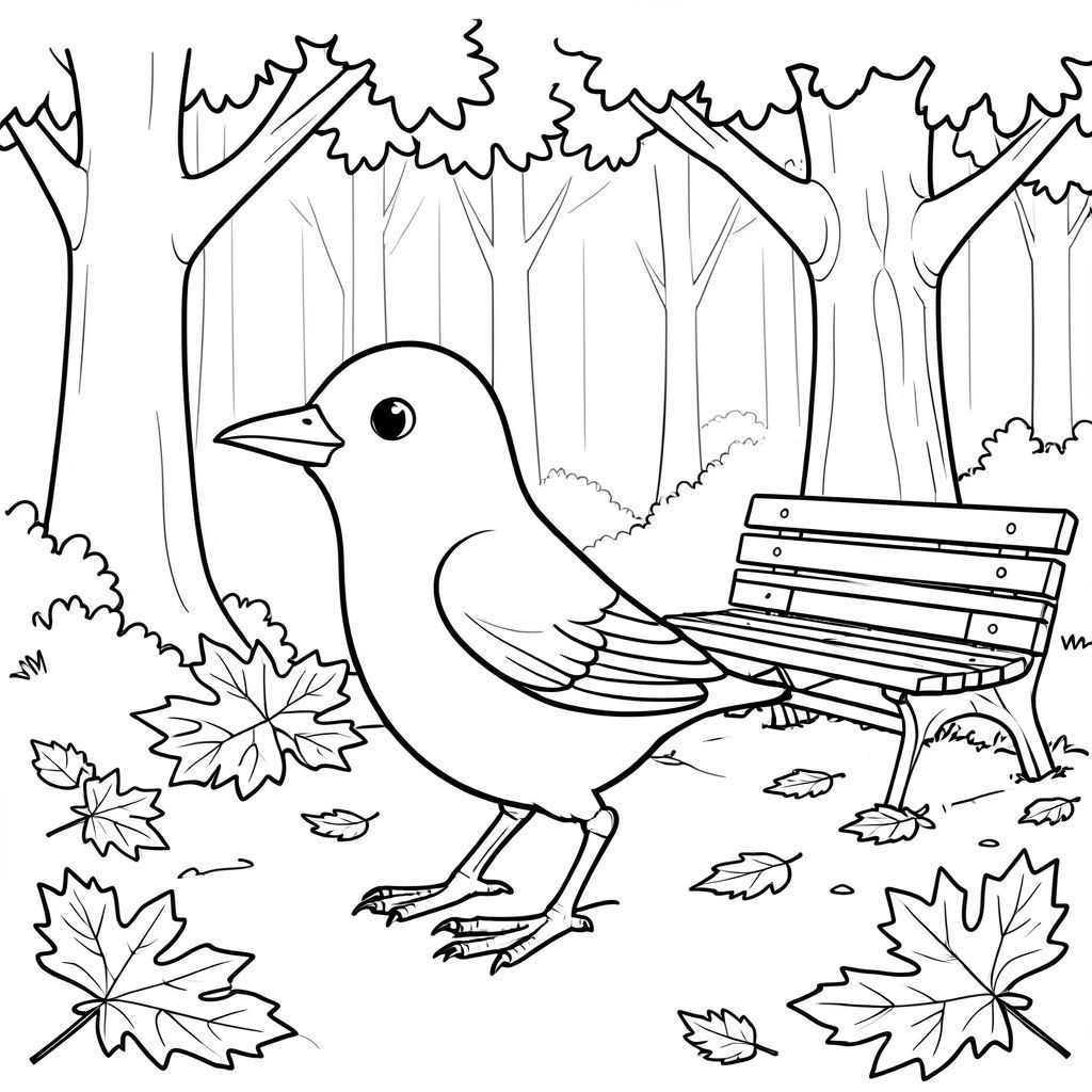 solo, single bird, one head, two eyes, one beak, two wings, two legs, one tail, natural proportions, proper scale in environment, anatomically correct, bird, oak tree, park bench, autumn leaves, fallen leaves, sunlight, background, simple, clean, forest, path, coloring page, line art, white background, solo, single subject, anatomically correct, perfect anatomy