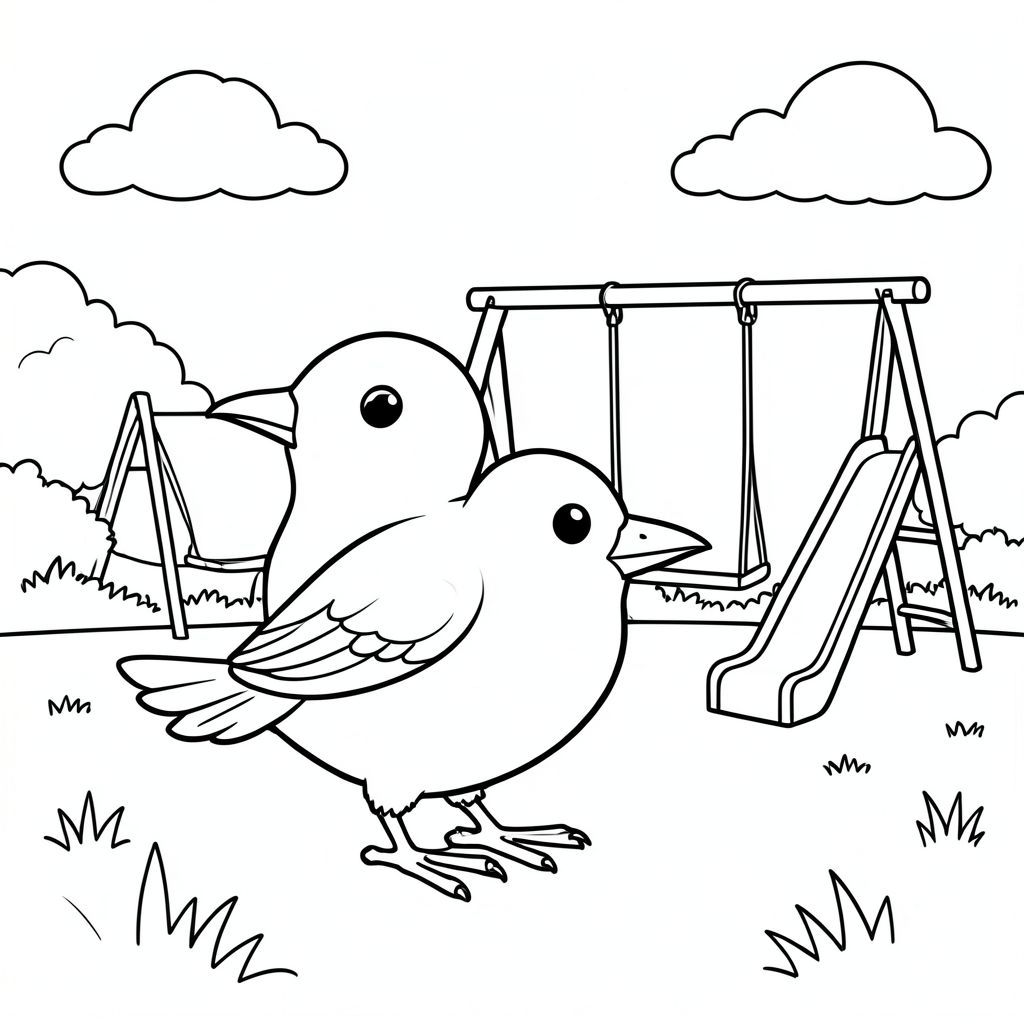 solo, single bird, one head, two eyes, one beak, two wings, two legs, one tail, natural proportions, proper scale in environment, anatomically correct, bird, playground, swings, slide, grassy park, sunny, clear sky, clouds, simple, clean, linear, coloring page, line art, white background, solo, single subject, anatomically correct, perfect anatomy