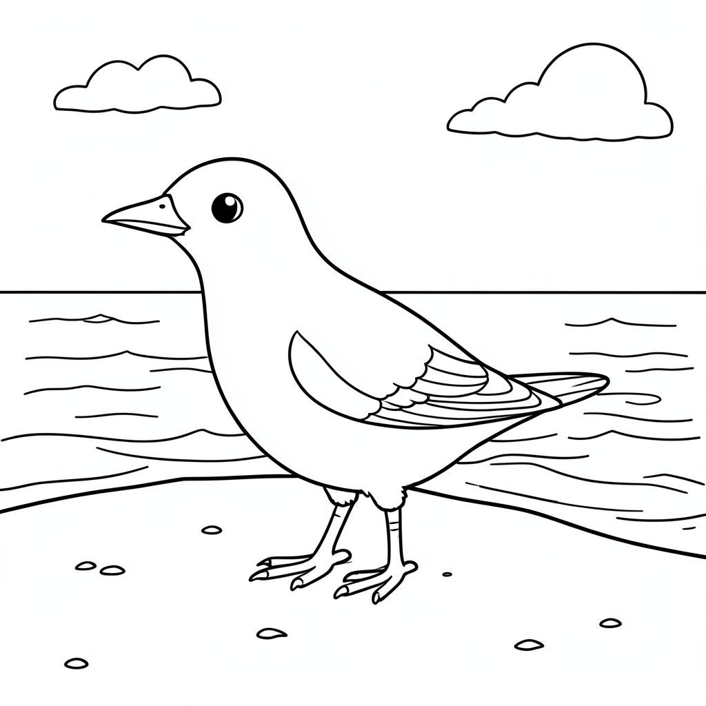 solo, single bird, one head, two eyes, one beak, two wings, two legs, one tail, natural proportions, proper scale in environment, anatomically correct, bird, Sandy beach, sand, water, clear sky, sunlight, waves, shoreline, small, simple, clean, coloring page, line art, white background, solo, single subject, anatomically correct, perfect anatomy