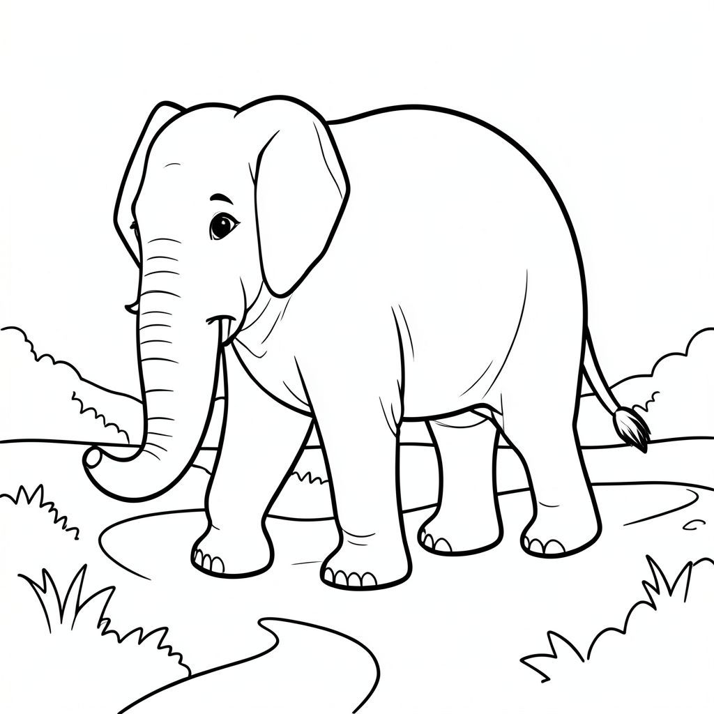 solo, single elephant, one head, two eyes, two large ears, one trunk, four legs, one tail, feet on solid ground, natural proportions, proper scale in environment, anatomically correct, elephant, canal, path, walking, trail, quiet, serene, calm, peaceful, simple, clean, coloring page, line art, white background, solo, single subject, anatomically correct, perfect anatomy