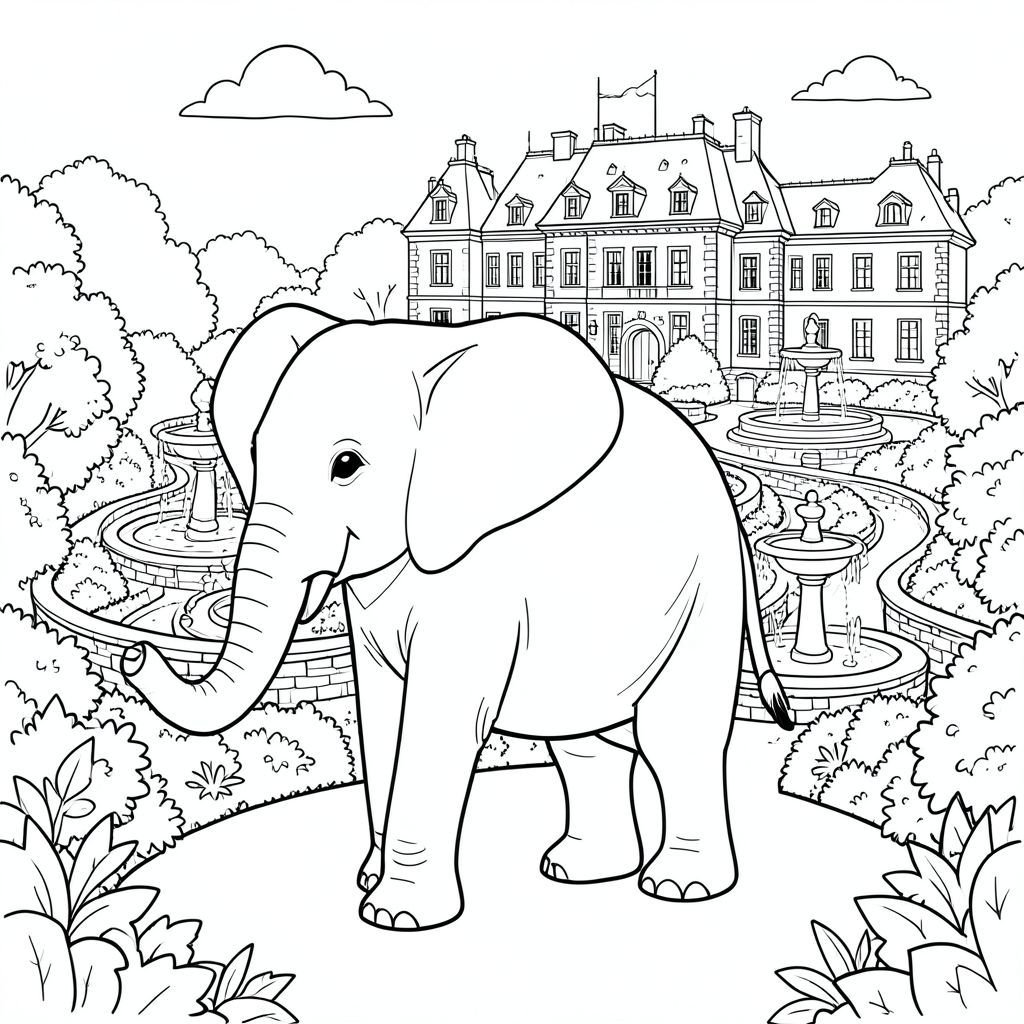 solo, single elephant, one head, two eyes, two large ears, one trunk, four legs, one tail, feet on solid ground, natural proportions, proper scale in environment, anatomically correct, elephant, French chateau, sprawling, manicured gardens, fountains, stone walls, lush greenery, winding paths, detailed foliage, sunlight, minimalist, coloring page, line art, white background, solo, single subject, anatomically correct, perfect anatomy