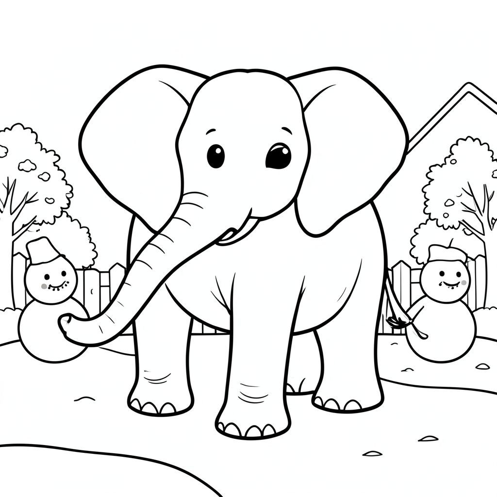 solo, single elephant, one head, two eyes, two large ears, one trunk, four legs, one tail, feet on solid ground, natural proportions, proper scale in environment, anatomically correct, elephant, Snow, winter, front yard, snowman, snow, fresh, white, simple, clean, background, coloring page, line art, white background, solo, single subject, anatomically correct, perfect anatomy