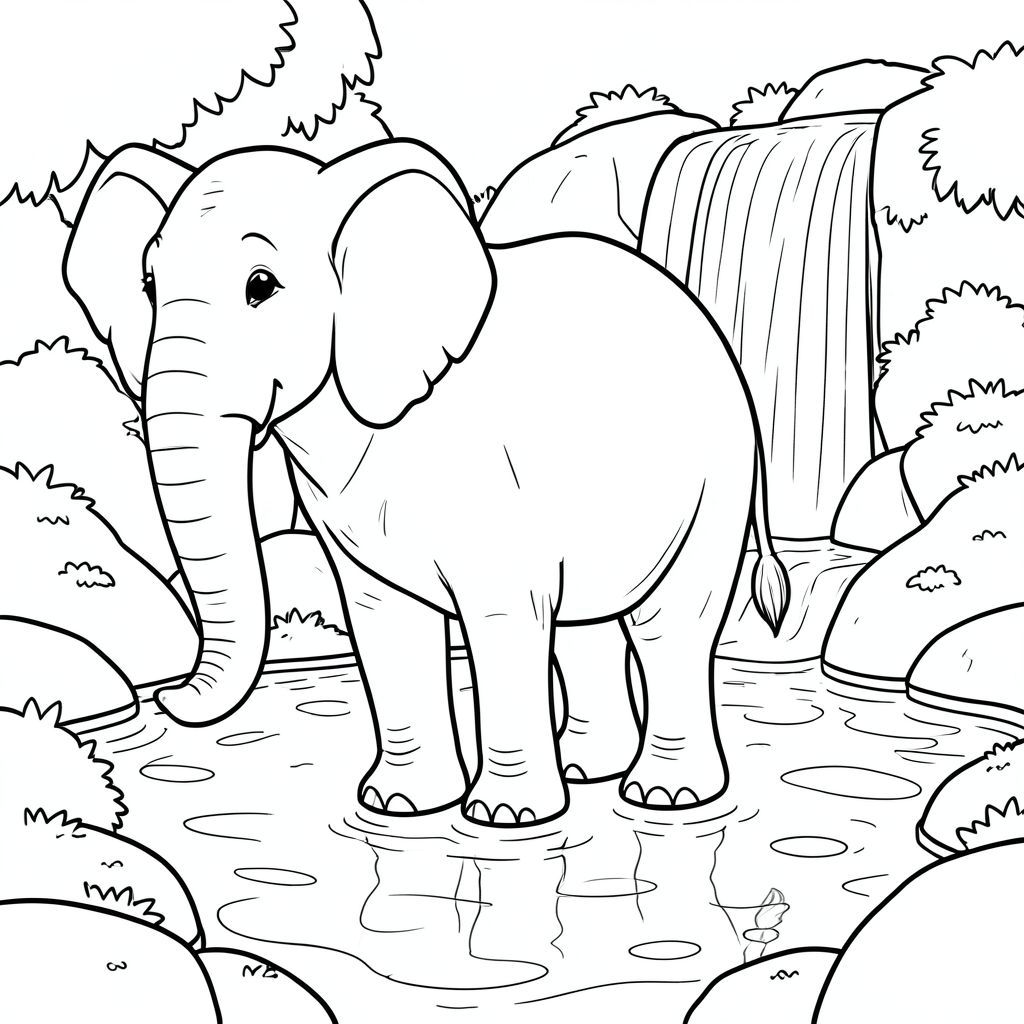 solo, single elephant, one head, two eyes, two large ears, one trunk, four legs, one tail, feet on solid ground, natural proportions, proper scale in environment, anatomically correct, elephant, waterfall, rocks, pool, clear, shallow, sunlight, reflection, smooth, stone, moss, coloring page, line art, white background, solo, single subject, anatomically correct, perfect anatomy