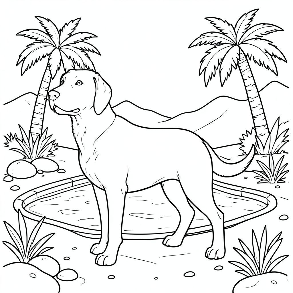 solo, single subject, four legs, one head, one tail, anatomically correct, dog, Desert, oasis, pool, palm trees, sunlight, clear water, smooth stones, sand, vegetation, distant mountains, coloring page, line art, white background, solo, single subject, anatomically correct, perfect anatomy
