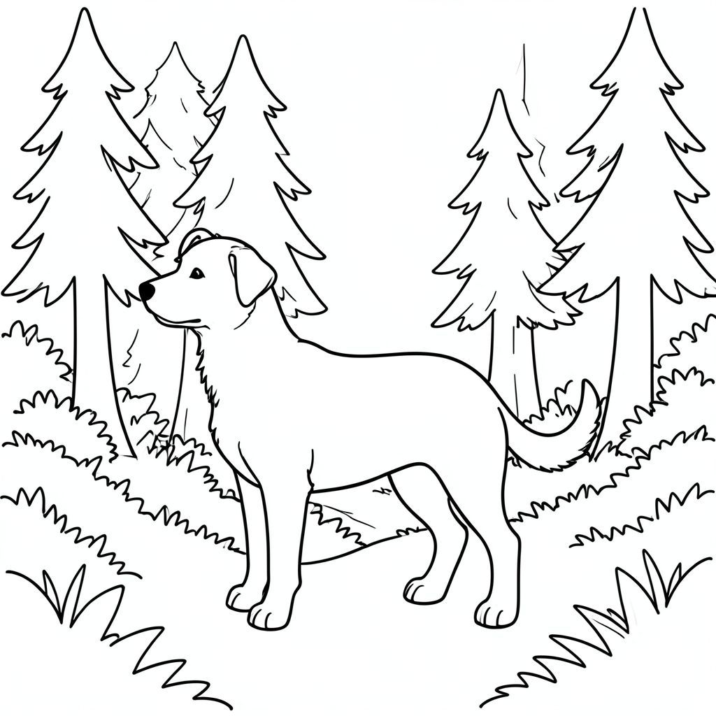 solo, single subject, four legs, one head, one tail, anatomically correct, dog, forest, path, pine trees, tall, trees, simple, clean, background, foliage, foliage, coloring page, line art, white background, solo, single subject, anatomically correct, perfect anatomy