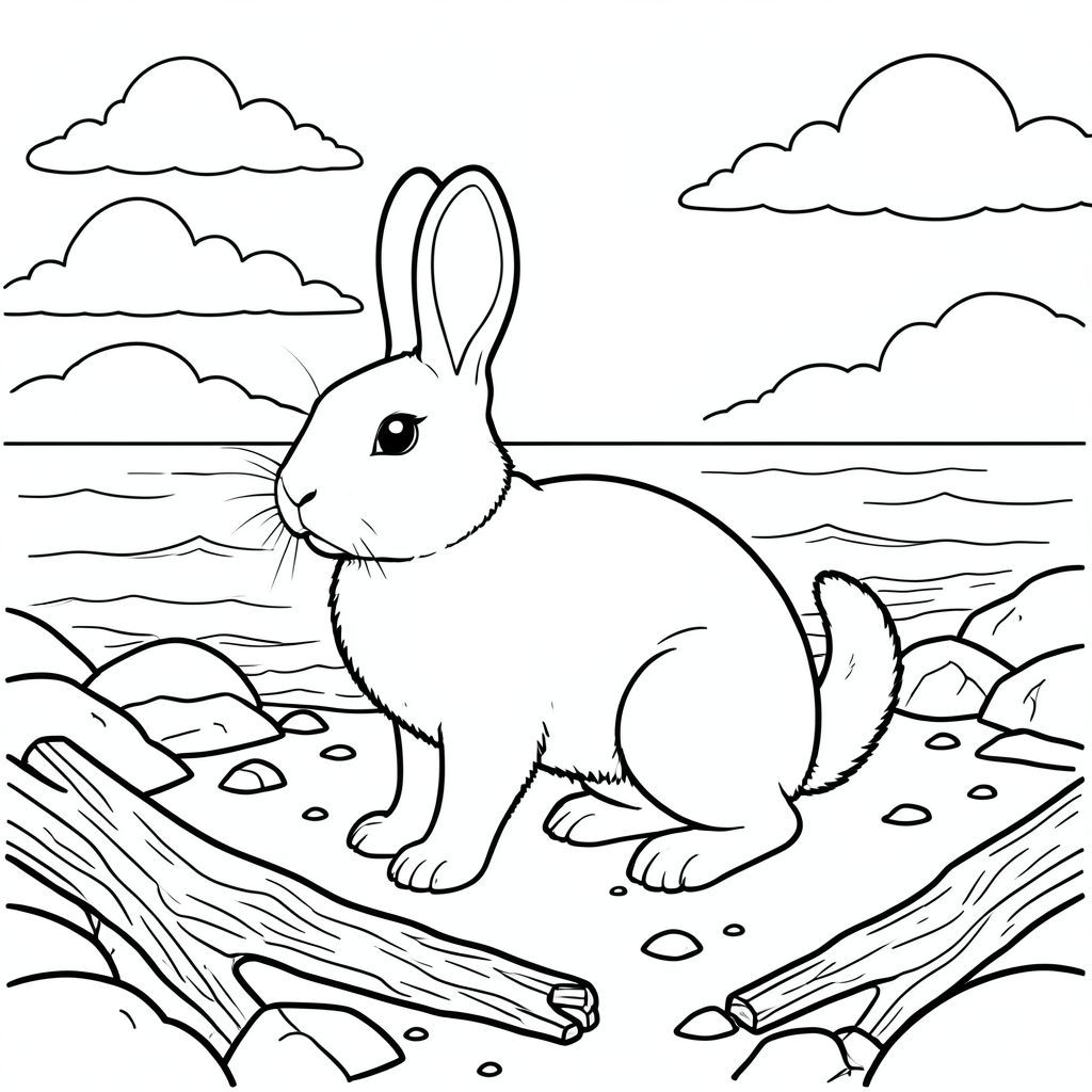 solo, single subject, four legs, one head, one tail, anatomically correct, rabbit, Rocky shore, driftwood, scattered, sand, rocks, coastline, ocean, sky, clouds, sunlight, coloring page, line art, white background, solo, single subject, anatomically correct, perfect anatomy