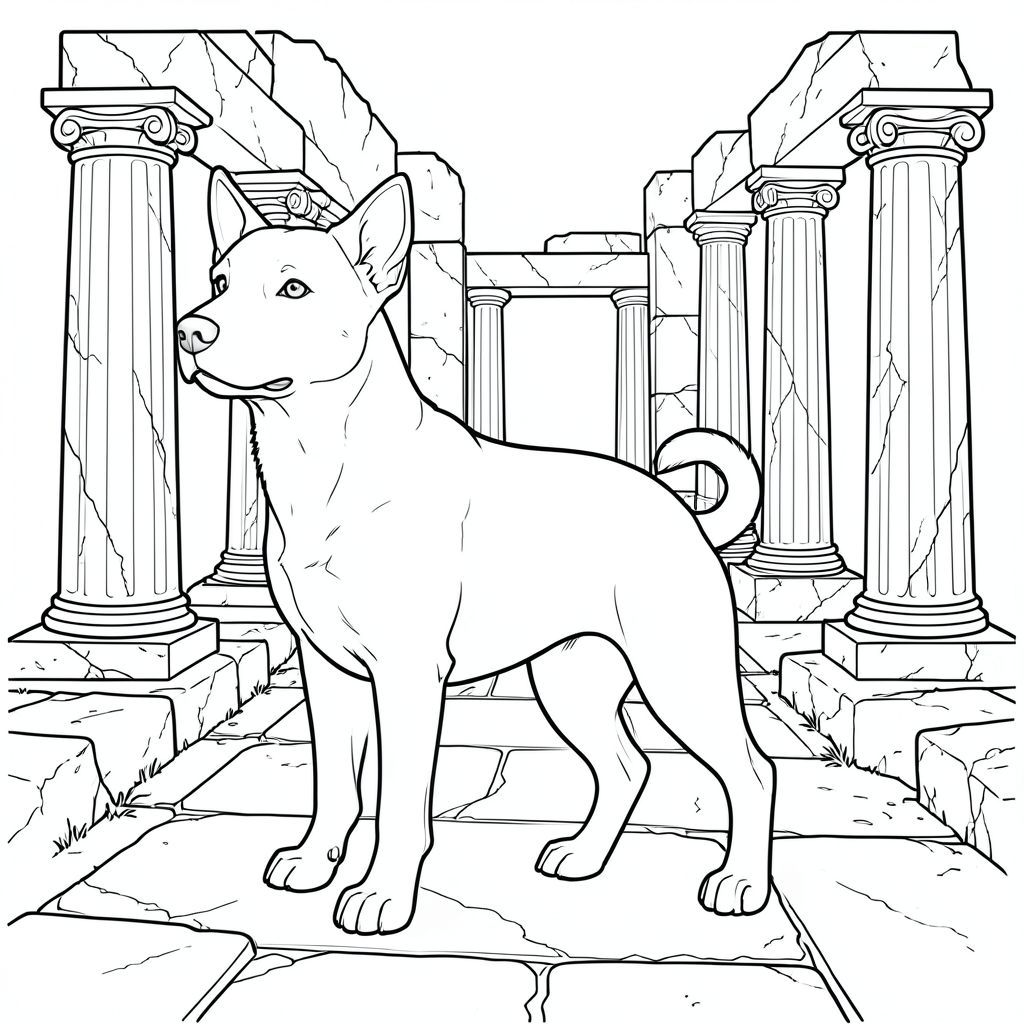 solo, single subject, one head, two eyes, two ears, four legs, one tail, anatomically correct, dog, Ancient ruins, marble columns, weathered stone, weathered surface, sunlight, perspective, depth, architecture, columns, pathways, coloring page, line art, white background, solo, single subject, anatomically correct, perfect anatomy