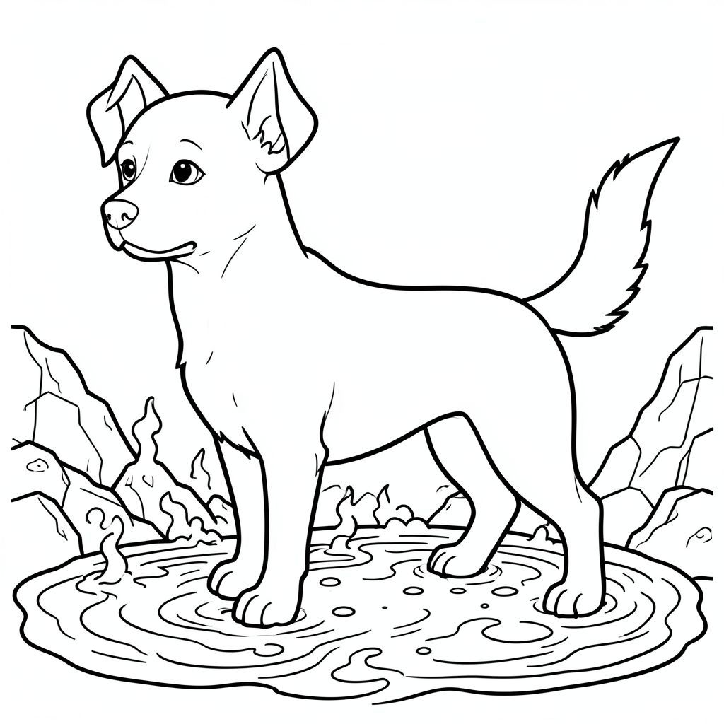 solo, single subject, one head, two eyes, two ears, four legs, one tail, anatomically correct, dog, Steam, hot springs, geothermal, volcanic rock, mineral deposits, bubbling pools, swirling water, intense heat, mineral, reflective surfaces, coloring page, line art, white background, solo, single subject, anatomically correct, perfect anatomy