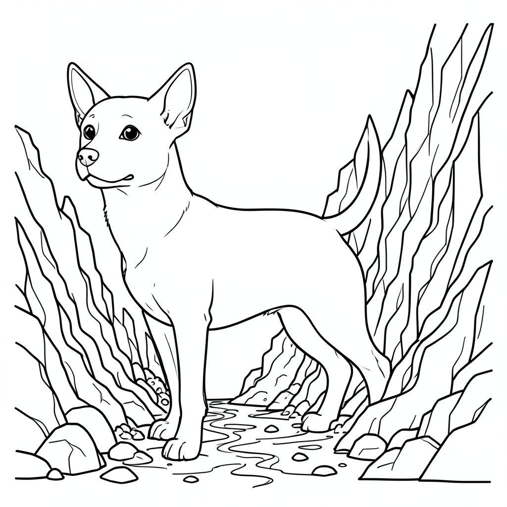 solo, single subject, one head, two eyes, two ears, four legs, one tail, anatomically correct, dog, Volcanic rock, lava flows, hardened rock, steam vents, jagged, steep walls, narrow passage, mineral deposits, geothermal activity, intense heat, coloring page, line art, white background, solo, single subject, anatomically correct, perfect anatomy