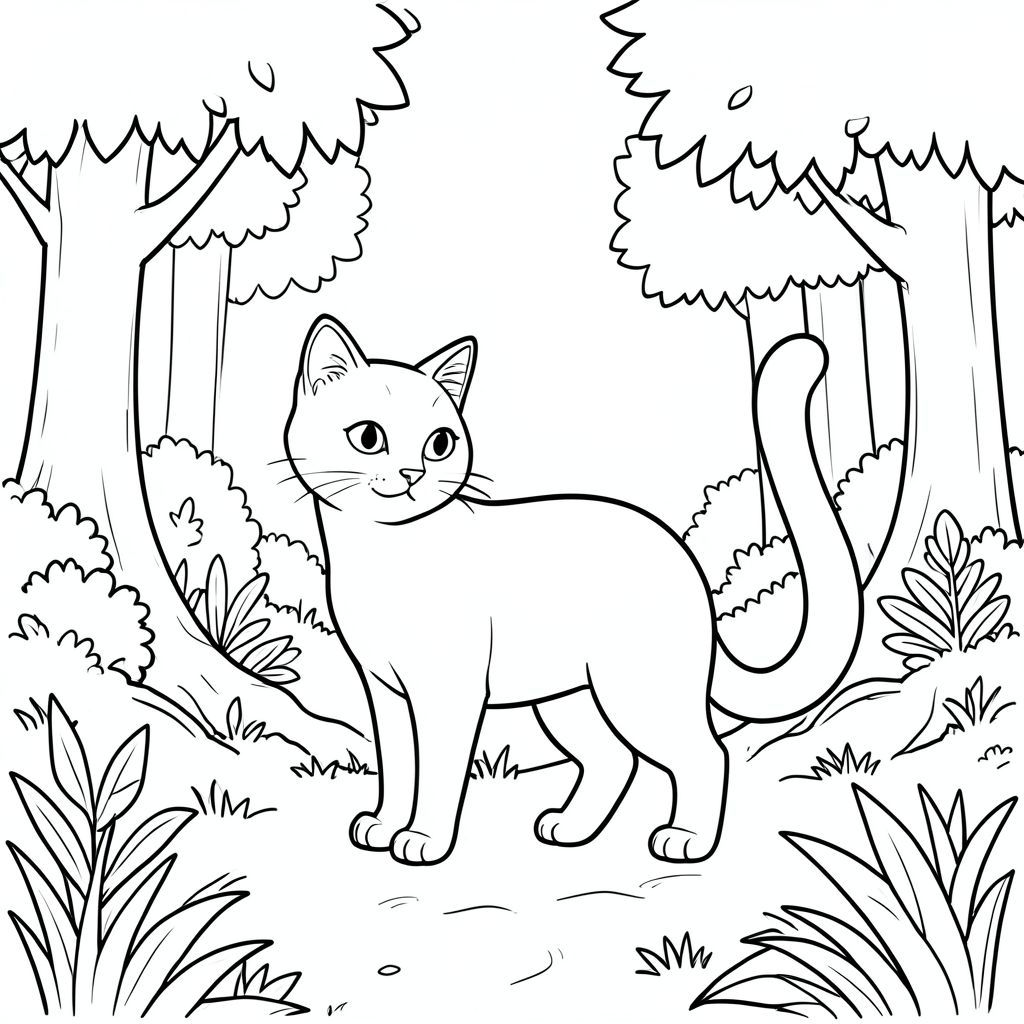 solo, single subject, one head, two eyes, two ears, four legs, one tail, natural proportions, proper scale in environment, anatomically correct, cat, grass, forest, path, trees, sunlight, clear sky, sky, foliage, leaves, roots, coloring page, line art, white background, solo, single subject, anatomically correct, perfect anatomy