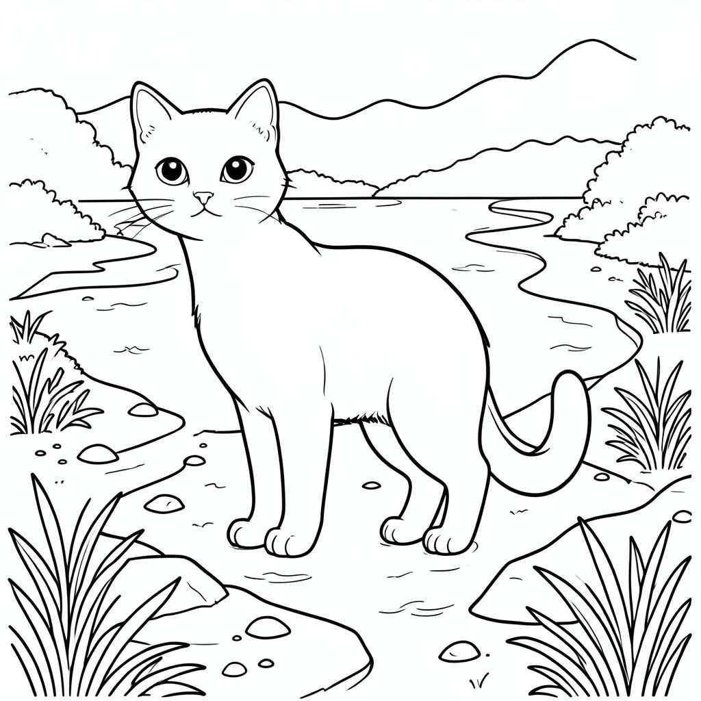 solo, single subject, one head, two eyes, two ears, four legs, one tail, natural proportions, proper scale in environment, anatomically correct, cat, River, delta, channels, sandbars, shoreline, water, rocks, mud, vegetation, dense, coloring page, line art, white background, solo, single subject, anatomically correct, perfect anatomy