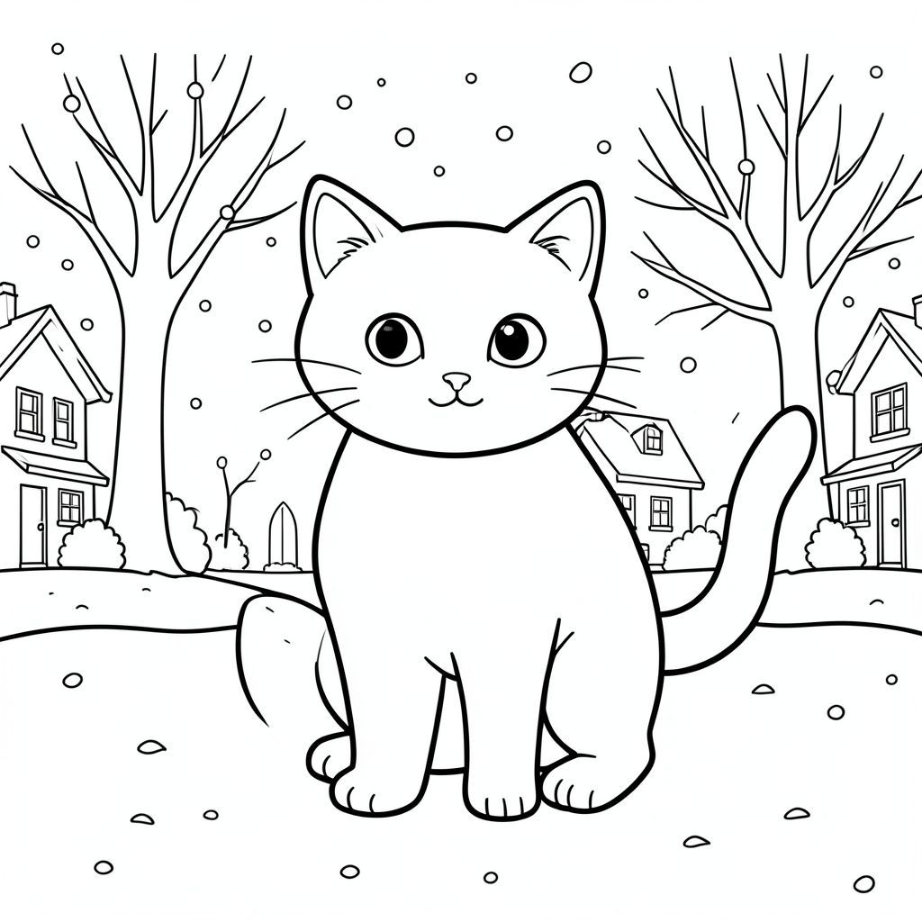 solo, single subject, one head, two eyes, two ears, four legs, one tail, natural proportions, proper scale in environment, anatomically correct, cat, snow, snowfall, quiet, neighborhood, bare trees, simple, clean, background, hand-drawn, doodle, coloring page, line art, white background, solo, single subject, anatomically correct, perfect anatomy