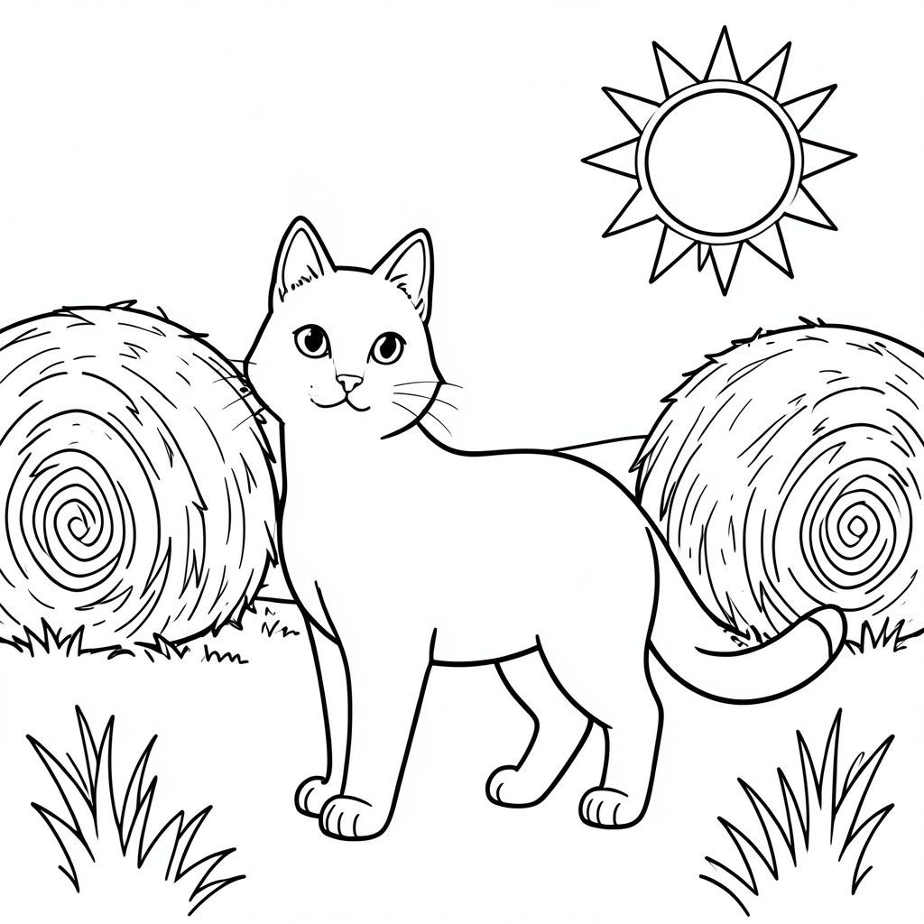 solo, single subject, one head, two eyes, two ears, four legs, one tail, natural proportions, proper scale in environment, anatomically correct, cat, sun, outdoor, stable, hay bales, paddock, grass, simple, clean, background, clear, coloring page, line art, white background, solo, single subject, anatomically correct, perfect anatomy