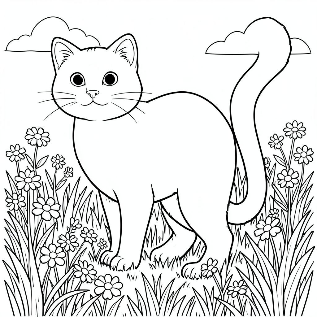 solo, single subject, one head, two eyes, two ears, four legs, one tail, natural proportions, proper scale in environment, anatomically correct, cat, Wildflowers, meadow, summer sky, warm, expansive, expansive, lush, textured, grass, tall, coloring page, line art, white background, solo, single subject, anatomically correct, perfect anatomy